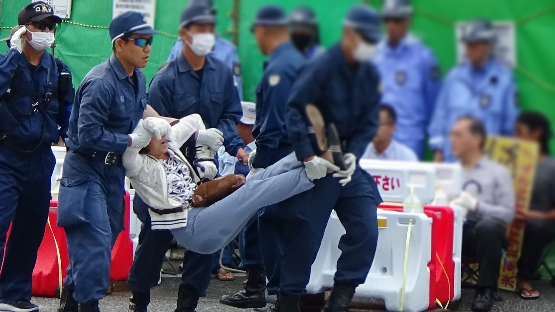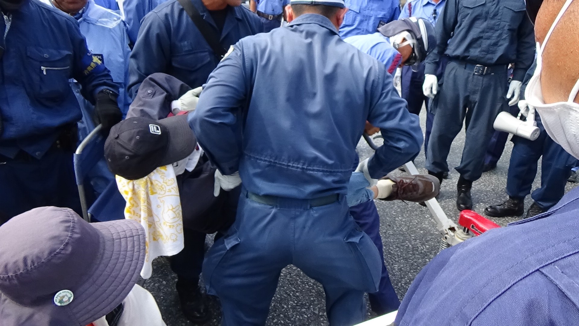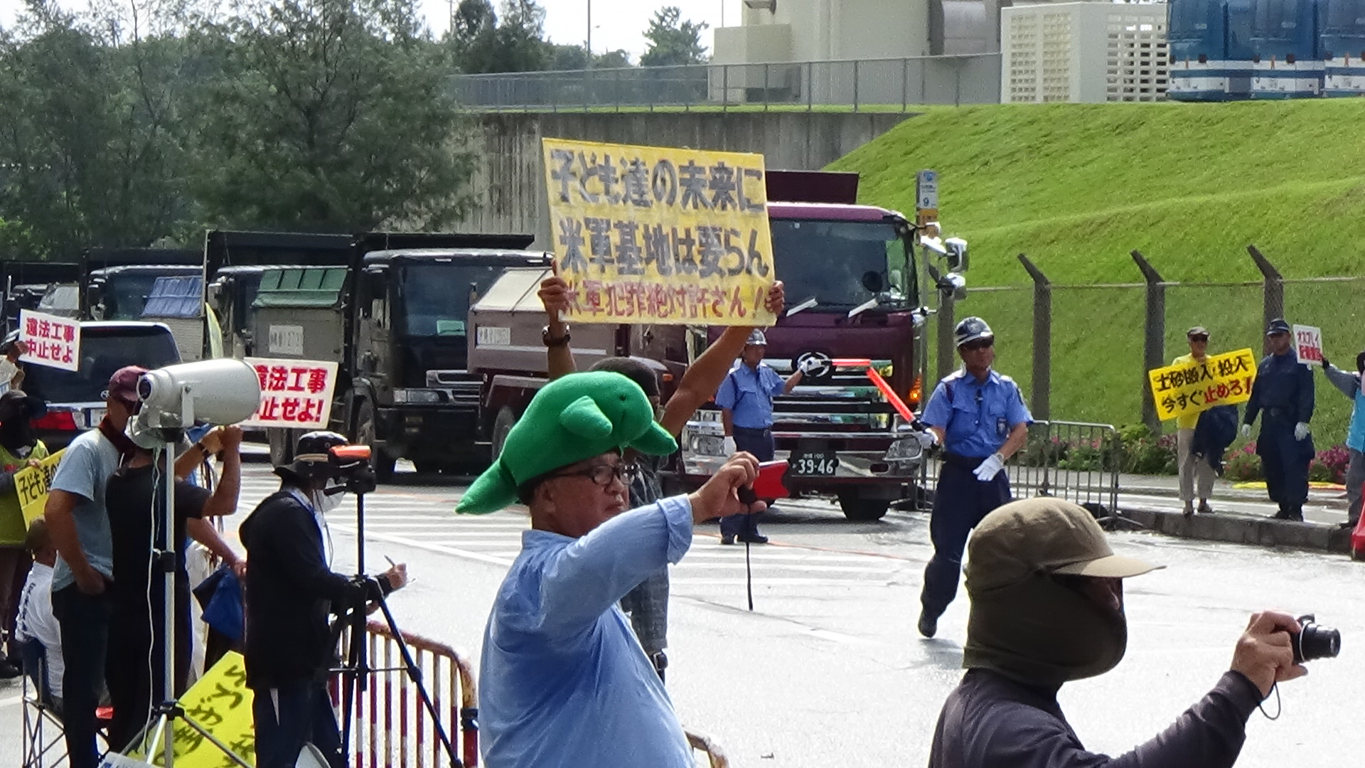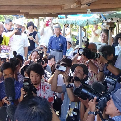 (in front of the gate)-A week has passed since the prefectual governor Onaga declared revocation of approval of embankment. The number of the people come to the gate for the protest from the mainland was 50 in the morning and this number has been increasing since the declaration by Onaga in spite of the intense heat and of the high travel cost. They have come here for the critical protest starting from August 6.The riot police forcibly removed the people one after another as usual. 179 dump trucks with sediment passed through the gate at 9:10 am, 146 dump trucks with sediment passed through the gate at noon while 110 people tried to stop them, and 140 dump trucks with sediment passed through the gate at 3 pm. Most of the people for the protest are old. They are old enough to know what had happened during the world war two in Okinawa and how horrible it was. They never want a war happening in Okinawa. They never want a base that could become a target if a war break out. They shall overcome US base.