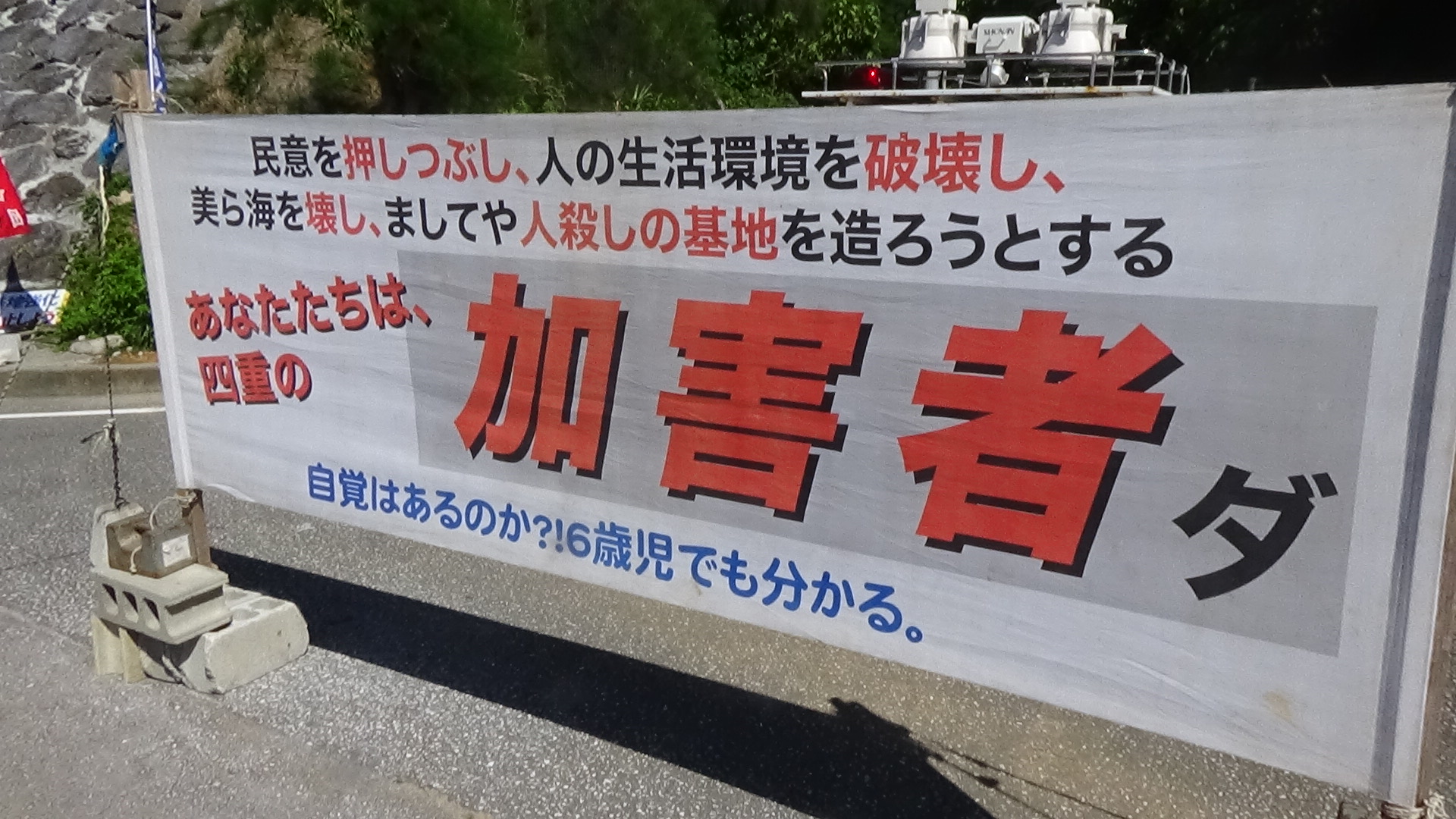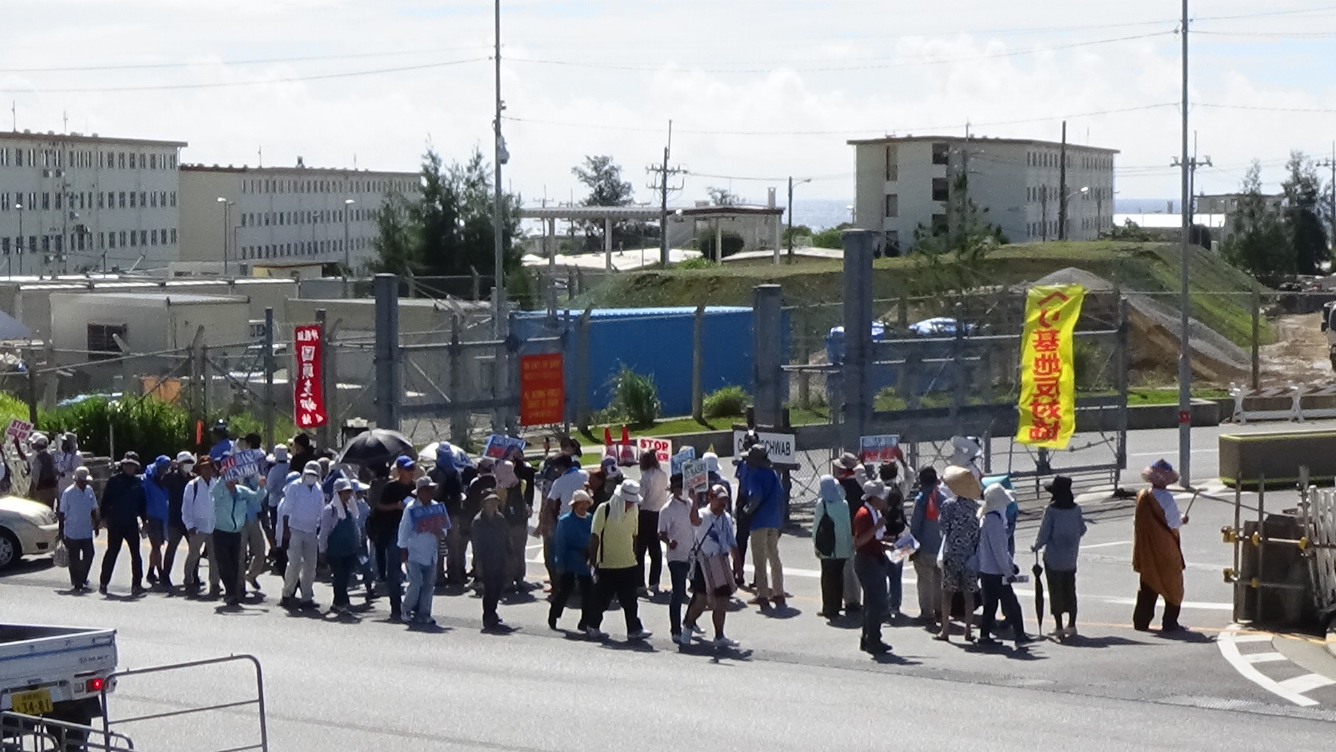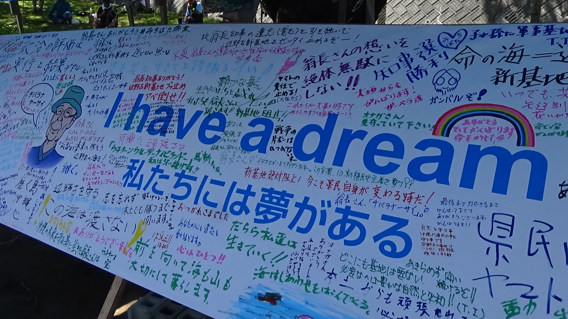report of August 18-(in front of the gate)-the last day of 3 day-anti-US base-demonstration.150 people started sitting down to demonstrate at 8:30 am.Despite of the intense heat, the people shared great joy cheering with each other with singing and dancing for the postponed land reclamation. There was a big horizontal banner to protest against new US base in Henoko on the sidewalk, which said,’ You are a criminal with 4 sins, ignoring democracy, destroying nature along with the whole living lives, destroying the environment, and building a base where is to be taught how to kill others. The people marched to the main gate calling for NO US-BASE. About 320 people gathered to greet to each other at the tent-mura which was made for the people gathering for anti-US base demonstration at noon. There were many words written by the people praying for the late prefectual governor Onaga on a flag in the tent. In the center of the flag the word by Pastor King was seen, which said, ‘I have a dream, we have a dream.’