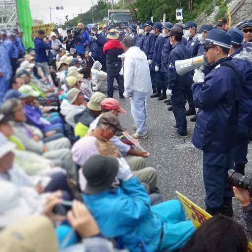 At 9:00am, 20 people resumed the sit-in. A green net that had covered the Gate was removed yesterday by Okinawa Defense Bureau, probably as a protective measure against typhoon. It now gives us a good view of the inside of the Gate, just like 3 years ago when the security was less severe.