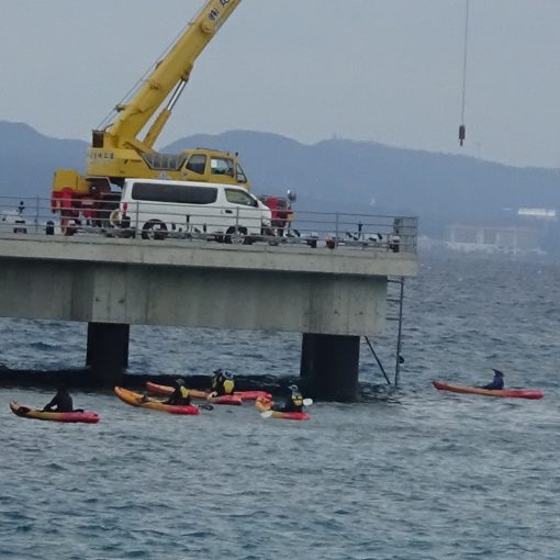About 600 dump trucks, the highest number of the trucks so far, carried the soil/sand which were loaded into three carriers. For this pier, Ryukyu Cement has obtained permission “for public weal use” from the prefectural government under the condition that the relevant pier “should not be used for purposes other than the applied one.” Therefore, it deviates from the applied purpose to carry out soil/sand for construction of a new military base, and the action taken by the Okinawa Defense Bureau is obviously illegal.