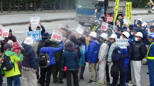 Approximately 120 citizens who oppose construction of the new base protested at Ryukyu Cement Co. pier in Awa, Nago City.