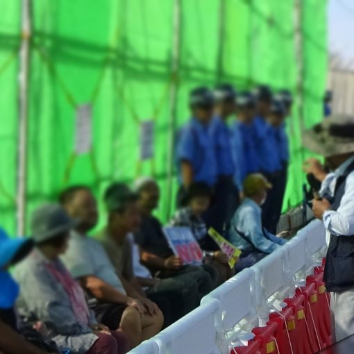 At 10:00am, 22 people resumed the sit-in. Crashed stones (about 50cm in diameter) to be used in the foundation of N4 seawall were delivered by trucks. A new seawall, N4, is under construction as a pier to receive dirt and sand to be dumped into a new zone where dumping starts from March 25.