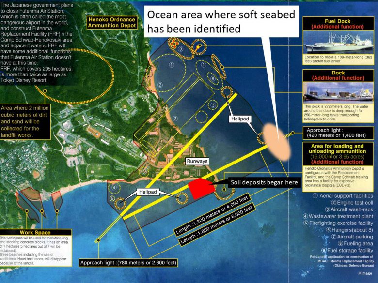 A prefectural government official said, “Even presuming that [ground reinforcement work] is a practical possibility, the time and expense of Henoko relocation will not lead to the return of Futenma Air Station as soon as possible.” There is soft ground spread throughout Oura Bay, and the Japanese government is considering ground improvement work that invloves driving approximately 60,000 sand pillars into the ground and compacting them, within a range of about 57 hectares.