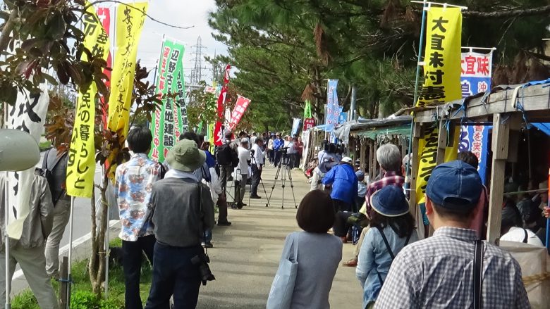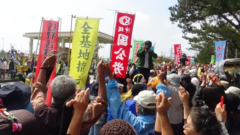 The meetings rallying against construction of the new base in Henoko are receiving more attention and support after the Prefectural Referendum. The 1st Saturday Intensive Action meeting in March was held in front of the Gate. Approximately 1300 people gathered holding banners and flags which gave lively colors to the scene. Messrs. Inamine Susumu and Takara Tetsumi who are the co-leaders of All Okinawa and some Diet members gave speeches criticizing the Administration.