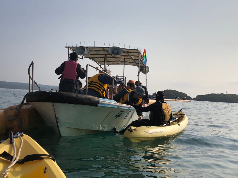 Under the sunshine like in the early summer, 3 boats and 8 canoes went out on the sea to protest and confirmed that no work under way on N4 seawall and that depositing dirt and sand into the designated landfill area was in progress. The canoe members called out to the workers in several hundred meters away through a loudspeaker in Okinawa direct.