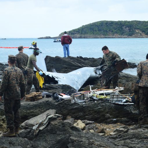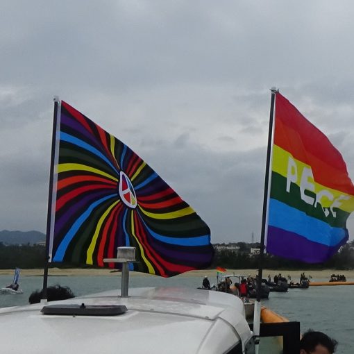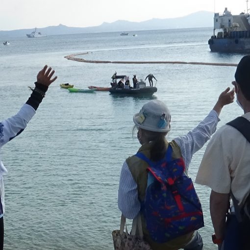Two boats and 7 canoes were out on the sea. The canoe team courageously went over the oil fences to stop the construction of K8 seawall, but was detained by the Coast Guard and taken to Matsuda Beach which is very far away. Since K8 seawall construction takes place in a shallow water, the seawall has been already extended 30 meters long.