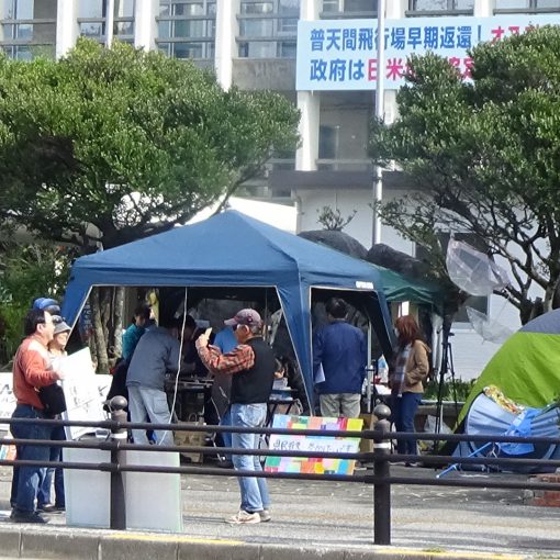 At 9:30am, 9 boats and 44 canoes held placards and rallied close to the area where depositing earth and sand was scheduled to begin. Through a loudspeaker to the Defense Bureau staff, protest slogans were repeated.