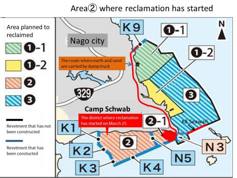 At 9:30am, 9 boats and 44 canoes held placards and rallied close to the area where depositing earth and sand was scheduled to begin. Through a loudspeaker to the Defense Bureau staff, protest slogans were repeated.