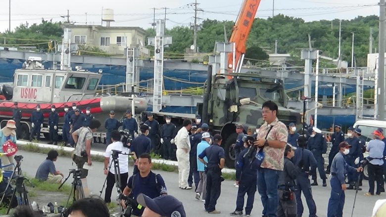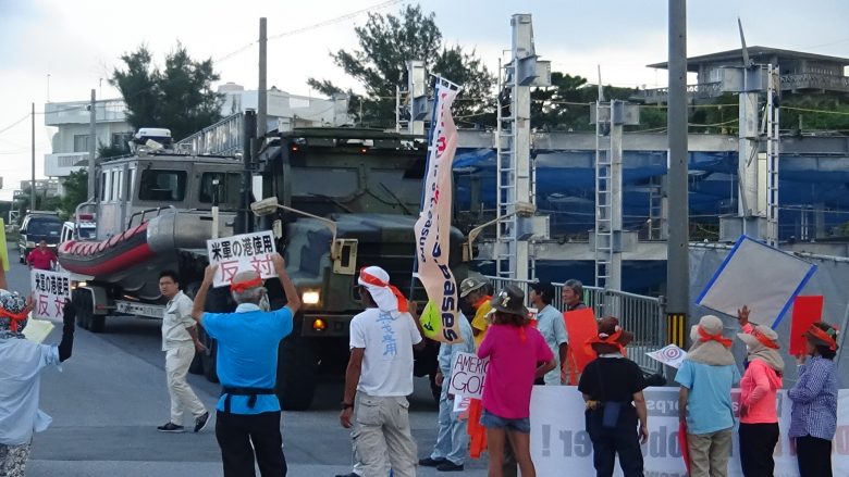 Many people started to show up at 6am at Motobu Port. When a US Marine Corps truck showed up towing a boat around 7 am, dock workers gathered inside of the gate, as people stood in front of the truck to block the approach to the port. As the number plate was missing on the truck, people accused it against the police and the Okinawa Defense Bureau. Meanwhile, the officials of the prefectural government, the Okinawa Defense Bureau and the headquarter of the US Forces in Okinawa seemed to keep the negotiation. Around 4:30 pm US military decided to return the truck and the boat. They announced that the parachute training scheduled on the day was canceled. It was a remarkable day when the people’s power defeated the arrogance of the US Marine who had tried to indulgently use land and sea of Okinawa by exploiting U.S.-Japan Status of Forces Agreement (SOFA).