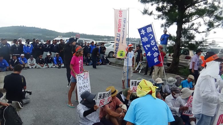 It was the day when Okinawa was encouraged. Yesterday, at Motobu Port citizens together with the dock workers successfully blocked the departure of a US Marine’s boat, which was planned to be used for the parachute training performed offshore of Ie Island. On the previous day, Okinawa Prefecture officials as well as Motobu Municipal office asked the Marines not to use the port, but their requests went unheeded. As this was the first time that the US Forces tried to use the local port, people got deeply motivated to prevent the Marines from exploiting this opportunity to create a fait accompli.