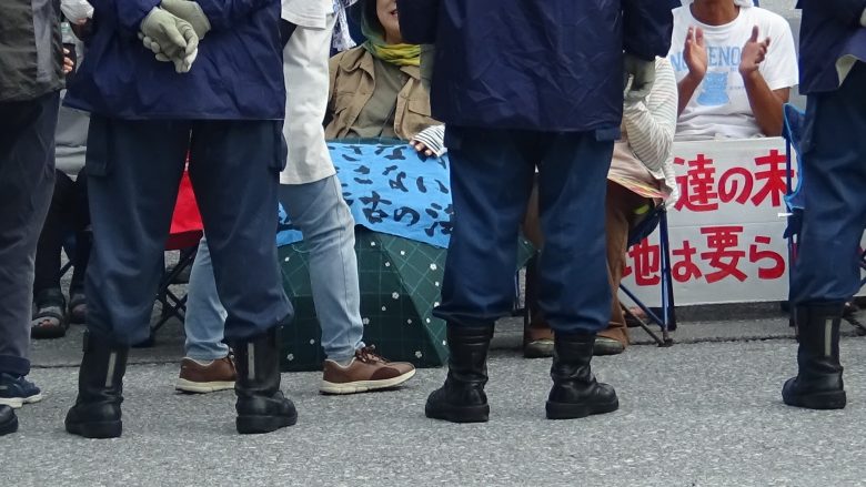 At 9am nearly 30 people gathered at the Camp Schwab Gate to sit in. Yesterday at Motobe Port peaceful protestors successfully blocked the US Marine to use the local port. Excitement caused by the news got reverberated in speeches especially made by the participants from the mainland, who said “the fight in Okinawa is amazing” and “this news will definitely empower everyone across Japan.” Five Students of Meiji Gakuin University visiting from Tokyo were excitedly listening to these remarks.