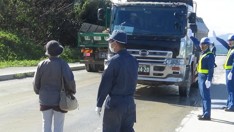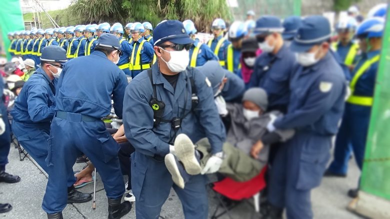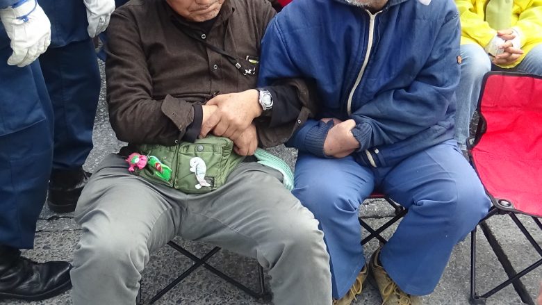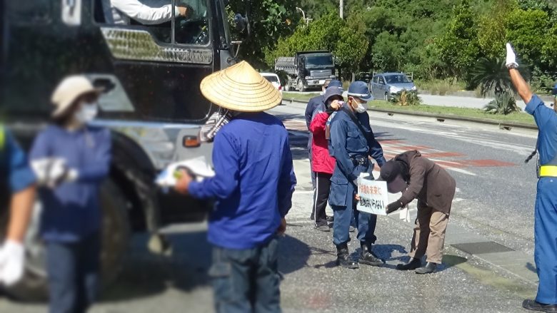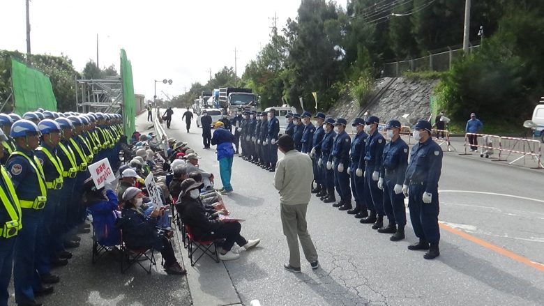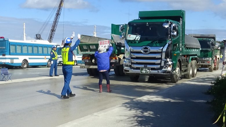 Eleven members of the Shimagurumi Uruma stopped the dumps driving toward Awa for nearly one and half hours, until dozens of the riot police rushed in to remove them at 8:45 am. Although being a small group, they kept protesting. 311 truckloads of earth and sand were loaded on the cargo ships.