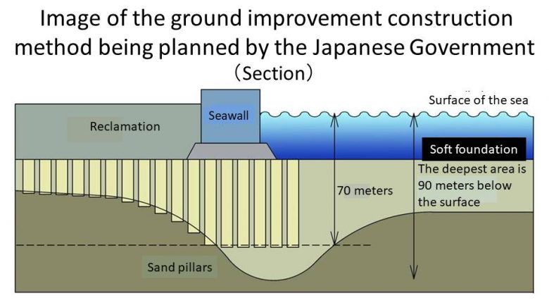 According to the revealed new plan, the Ministry is considering hammering 77,000 sand piles into the seafloor to reinforce the soft ground. They estimate 4 years and 1 month to be needed for the ground impromvement. In addition, special work vessels are required for the work. During a reply by the government in the Diet on Feb 25, it turned out that currently only 10 vessels exist in Japan rather than 15 as previously announced. Among these 10, only three can be workable below more than 70 meters from the sea surface. If all the available vessels would be used only in Oura Bay during this period, no other ground improvement works at sea could be executed. The ground improvement work below 90 meter from the sea surface has been unprecedented anywhere on the earth. Both the U.S. and Japanese governments have kept insisting that Henoko is the only choice. How long will they stubbonly stick to their plan by keep spending tax payers’ money like water? The conclusion is evident.