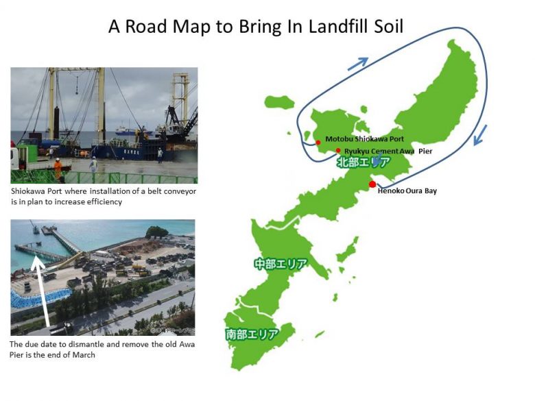 Anticipating the lowered efficiency of earth/sand shipping from the pier at Awa, the Okinawa Defense Bureau requested the Okinawa Prefectural government for the use of a ”belt conveyor” at Shiokawa Port in Motobu Town. They want to increase the efficiency by using a belt conveyor rather than loading earth/sand from a dump truck to a carrier ship. However, installation of a belt conveyor also requires an approval of the Prefectural government.