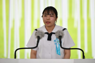 After Gov. Tamaki’s peace declaration, Akane Takara, 17, a senior student at Shuri High School, read her poem dedicated to peace, titled Anata ga Ano Toki (literally: you at the time). Takara incorporated tragic stories told by WWII survivors into her poem. She is dedicated to “creating a peaceful world.”