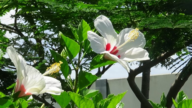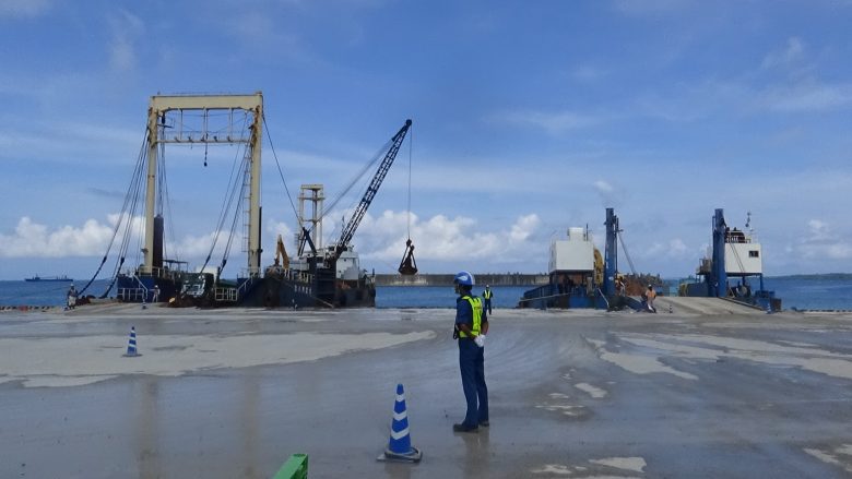 A rapid increase in the number of covid-19 infected cases and the unprecedentedly hot summer dramatically reduced the number of participants in the protest. Only several persons participated in the protest. Hibiscus blooms in various colors along a fence were beautiful. Sand/soil for 769 vehicles was loaded to three carriers, which left the pier.
