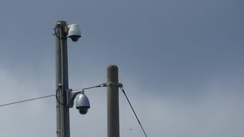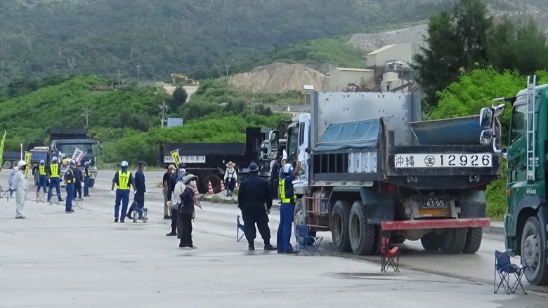 About 20 persons made the protest. They delayed the transportaion work by walking slowly in front of the dump trucks loaded with soil/sand. Two carriers are docked at the pier since last week and simultaneously loaded. It seems that the Prime Minister’s office urges the Okinawa Defense Bureau to speed up the work because the delivery and shipping are considerably delayed due to the bad weather and the protest movement. However, the number of dump trucks has not been increased much. A surveillance camera has been set up in a corner of the pier. It is said that the camera is linked directly to the Prime Minitster’s office.