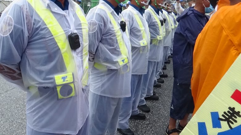 Mr. Hiroji Yamashiro asked the person in charge of the operation site for the reason, and the answer was: to leave any evidence of the crime/accident site in a case when a security guard is summoned to a court. A case of a security guard injuring a citizen during a protest rally in Shiokawa was already in the court, and they like to be prepared for a similar case in the future.