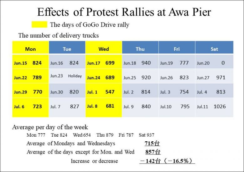 We estimated the effect of the GoGo Drive Campaign in which the participants drive slowly at the pier’s entrance and exit to reduce the delivery amount. The average number of deliveries per day on Mondays and Wednesdays when the GoGo Drive members rally is 715 truckloads, and 857 truckloads on other days. That is a reduction of 142 truckload delivery per day (or 16.5%). A small number of 10 members has made a significant delay in delivery operation. Indeed, the protesters rallying at the pier’s entrance and exit also make the protest stronger and contribute to delaying the delivery operation. We should be confident and proud.