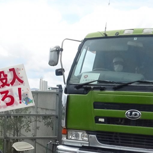 There were only four protesters from the Shima-Gurumi Motobu chapter. There is no police figure. In the heat and dust blown by the dump trucks, they continued to protest by walking in front of the dump trucks holding a banner all day long.