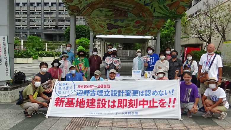 Some of the protesters in front of the gate took to the streets to start the action at Nago City, Ginoza Village, Towns of Motobu and Kyan, etc., aiming to collect 10,000 opinion statements. All groups gathered Sep 27, the last day of entries, in front of the prefectural office for calling on the people of Okinawa. Hiroji Yamashiro appealed on the microphone, “If the number of the current submission goes over 10,000, exceeding the history of all previous opinion statement submission. It will be strong support for Governor Denny Tamaki to disapprove of the revised construction plan.