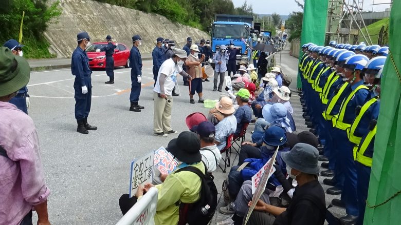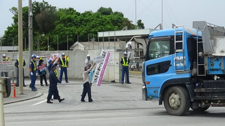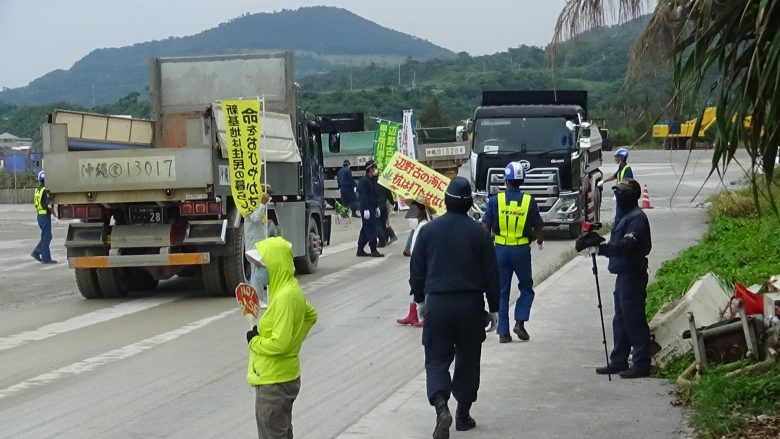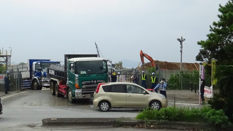 About 15 members, including those of Okinawa Heiwa Shimin (Okinawa Peace Forum), strolled in the pier grounds and delayed dump trucks’ runs. It seems that the soil and sand have come from a new quarry since last week. Most of the dump trucks are approaching the pier from another direction. Besides that, the operation is at a faster tempo. Mr. T, a resident of Motobu Town who has been monitoring Shiokawa Pier for a long time, says, “The main port of shipping the soil and sand will be Shiokwa. The use of the Ryukyu Cement Pier, being a private pier, is an easy target of criticism.” ing. If Shiokawa Pier becomes the main port of shipping, we have to revise our way of protest