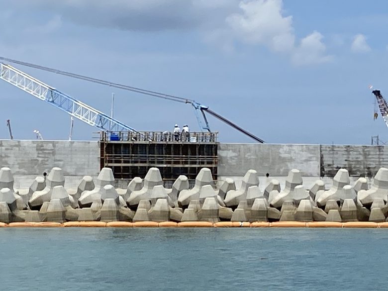 A photo below shows the construction of the seawall for bringing the landfill site’s ground level higher.