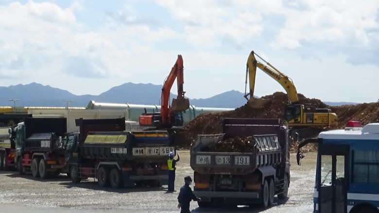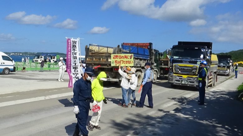 No sand/soil shipped out because a Ryukyu Cement Company’s coal ship occupied the pier. Coal transportation is the Company’s business. About 20 citizens rallied in protest, dividing into two groups at the pier’s entrance and exit to the dump truck drivers. Seven GoGo Drive members participated in the rally. They delayed the dump trucks run, which enclosed dozens of the trucks on the pier grounds for a while. They transported soil and sand from the quarry by 865 vehicles to temporary storage space on the pier grounds.