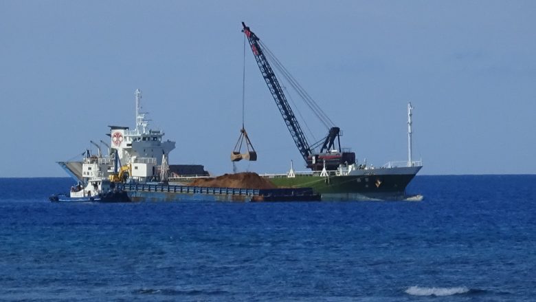 Continuing simultaneous loading to two sand carriers with a grab bucket, they loaded 619 truckloads of sand and soil to five sand carriers. They unloaded earth and sand from the sand carriers to load them to cargo ships offshore. They seemed to speed up the work to make up for the delay caused by the typhoon.