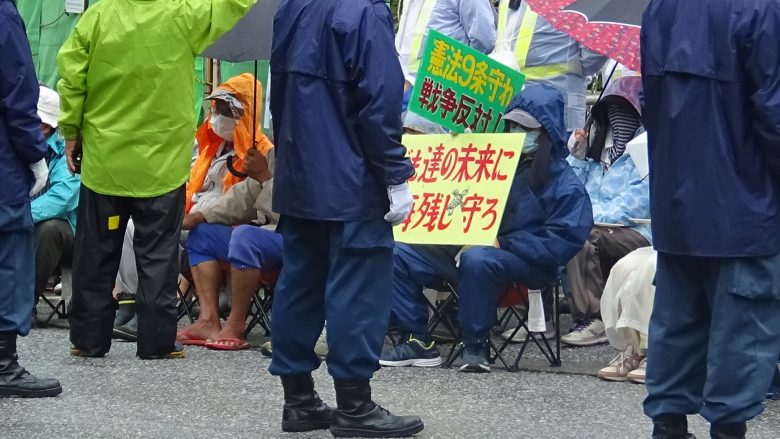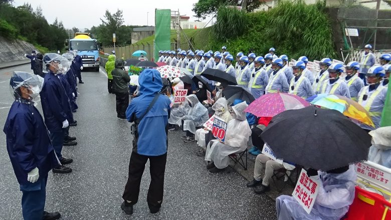Unless a typhoon comes, work on land will not stop. It was terrible weather continuing from the heavy rain of the previous day, raining on and off. But many concrete mixers and dumps entered the base. About 40 people dressed in rain gear protested all day.