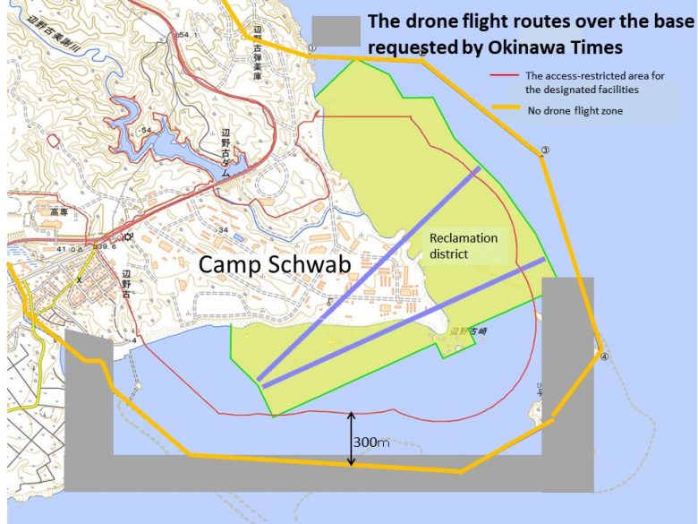 Okinawa Times reported that the U.S. military took more than three months to respond to a request to use a drone to take pictures of the sea by the Camp Schwab. The newspaper filed the request on Aug 7, stating that the drone flight to be made on Sep 7 when the Revised Drone Regulations come into effect. However, the military’s approval came on the 13th of this month; they put the request on hold for more than three months.