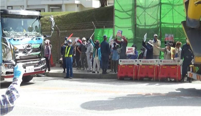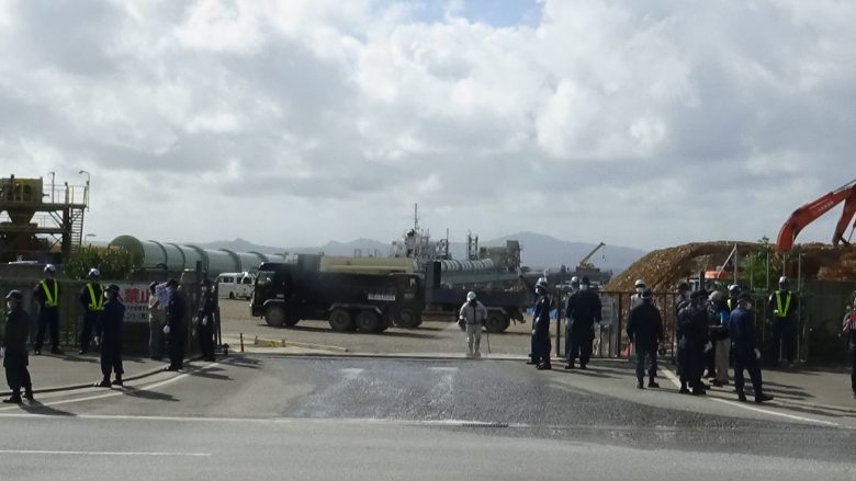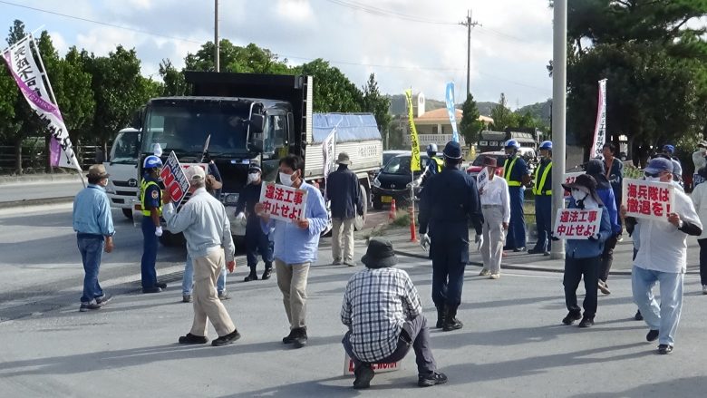 When the gate opened, and after the dump trucks entered inside the base grounds, the demonstrators paraded shouting messages, “The sea does not need concrete!” “The Defense Bureau! Do not violate the people’s will!”