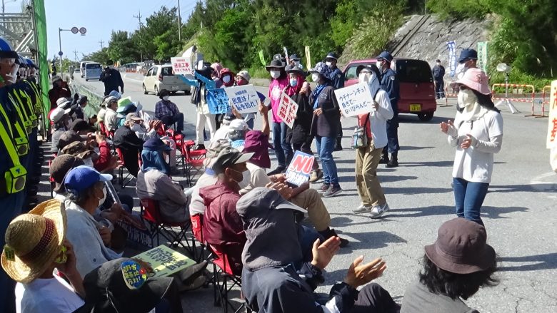 About 30 members of Nambu Shimagurumi (The Southern chapter of the Island-Wide Conference) protested at the pier’s entrance and exit. Riot police gathered around the exit gate and tried to stop the protest rally. Aggressive arguments repeatedly went on between the protesters demanding to walk crisscross the exit road and the commander H trying to let the trucks go through. He stopped the protesters crossing the road for over 20 minutes even when no trucks were coming out of the exit gate. The protesters shouted, “Excessive control!” and “No traffic rules favor vehicles over pedestrians!”