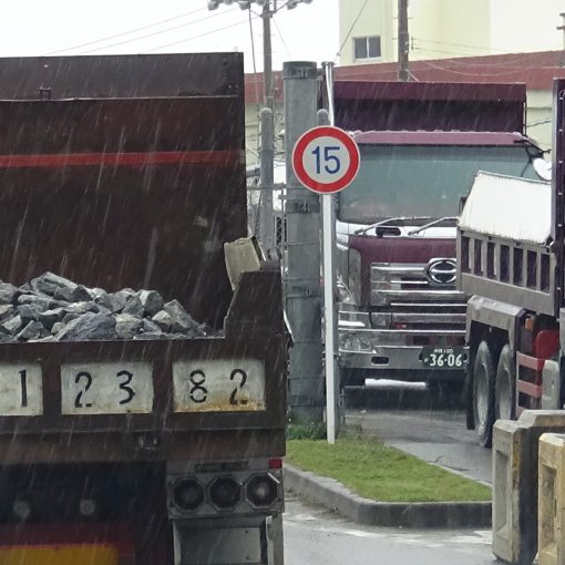Only five members of Motobu Shimagurumi (Motobu chapter of the Island-Wide Conference) made a protest. They showed their will of protest all day long by walking slowly in front of dump trucks, etc. Soil and sand delivered by 516 dump trucks were loaded to 4 barges.