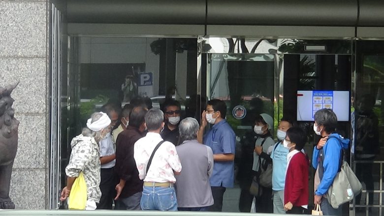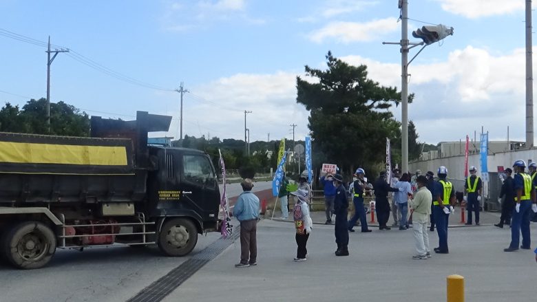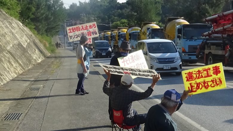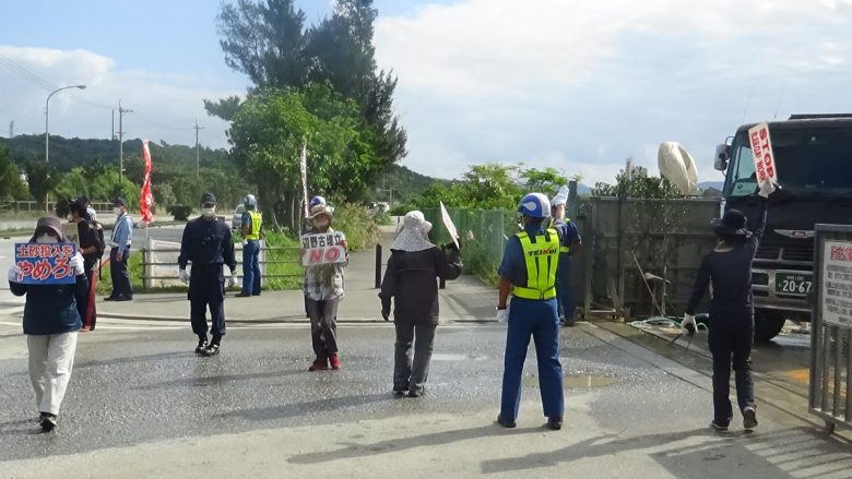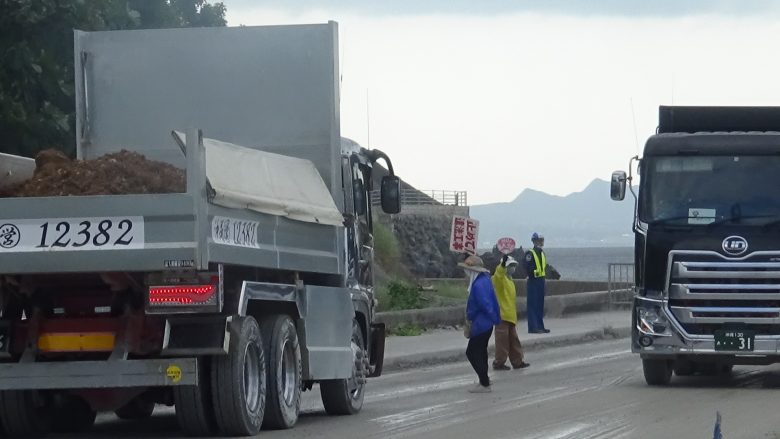 About 40 members of Nambu Shimagurumi (The southern chapter of the Island-Wide Conference), divided into two groups at the entrance and exit, continued the protest against the dump truck drivers delivering soil and sand.