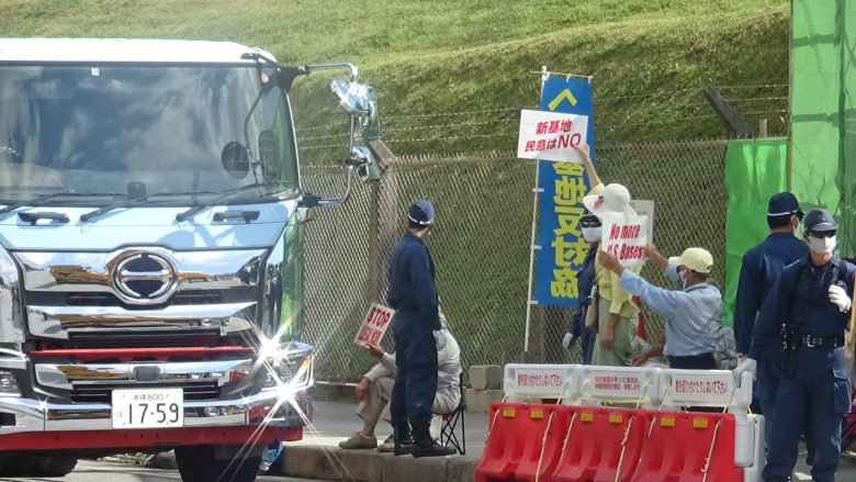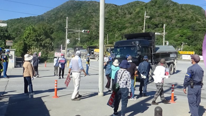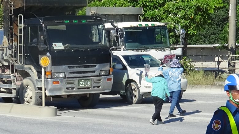 A barge with a rampway was used to upload, as this happens once a month. Using a rampway barge is much more inefficient than the usual one in which dump trucks drop the earth and sand directly. Therefore, dozens of trucks had to wait. The members of Motobu-machi Shimagurumi (Motobu chapter of the Island-Wide Conference) disbanded before noon as they saw no need for protest action to delay the day’s uploading operation.
