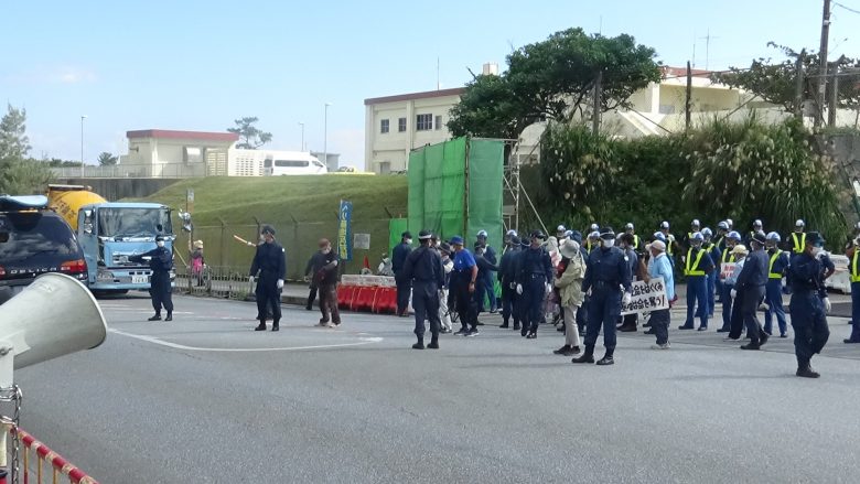 Approximately 40 people, including the Okinawa Heiwa Shimin Renkarkukai (Okinawa Peace Forum) members, kept protesting toward the dump trucks at the entrance and the exit at the pier. Three days ago, we filed a claim to the Public Safety Commission that the language and behavior of Chief H of the riot police should be illegal. Probably because of this filing, Chief H showed up but did not instruct the troop, and the riot police’s control was relatively lukewarm today. The free and emancipated space for the protest, which we enjoyed until six months ago, came back.
