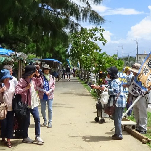 We asked for comments from 2 participants in the protest. Ms. Nakazato Suzuyo (81 years old), one of All Okinawa Coalition co-directors, expressed her anger. “I am enraged that the base construction works are going on while the people are suffering from the COVID-19 pandemic. It is unnecessary and not essential at all at this time of national emergency. It’s a crime against humanity,” she said. Ms. Sato Akemi (69 years old), who likes dancing, said, “I learned today that some activities are going on to support day laborers who had lost their jobs due to the COVID-19. We should use tax money to help them. Spending on the base construction is just a waste of our tax money. I stop the construction of this new base by any means available.”