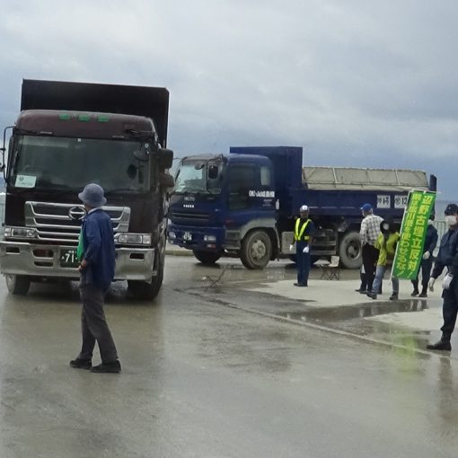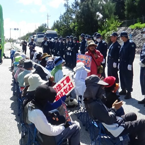 朝9時、すでに30度近い猛暑の中、約40人がゲート前に抗議の座り込みを行った。昼頃には全国うたごえ協議会のメンバー40人が応援に駆け付け、ゲート前で「青い空」「沖縄を返せ」などの歌を披露。早稲田大学の教授、学生らも取材に訪れた。選挙応援のため正午過ぎに解散した。