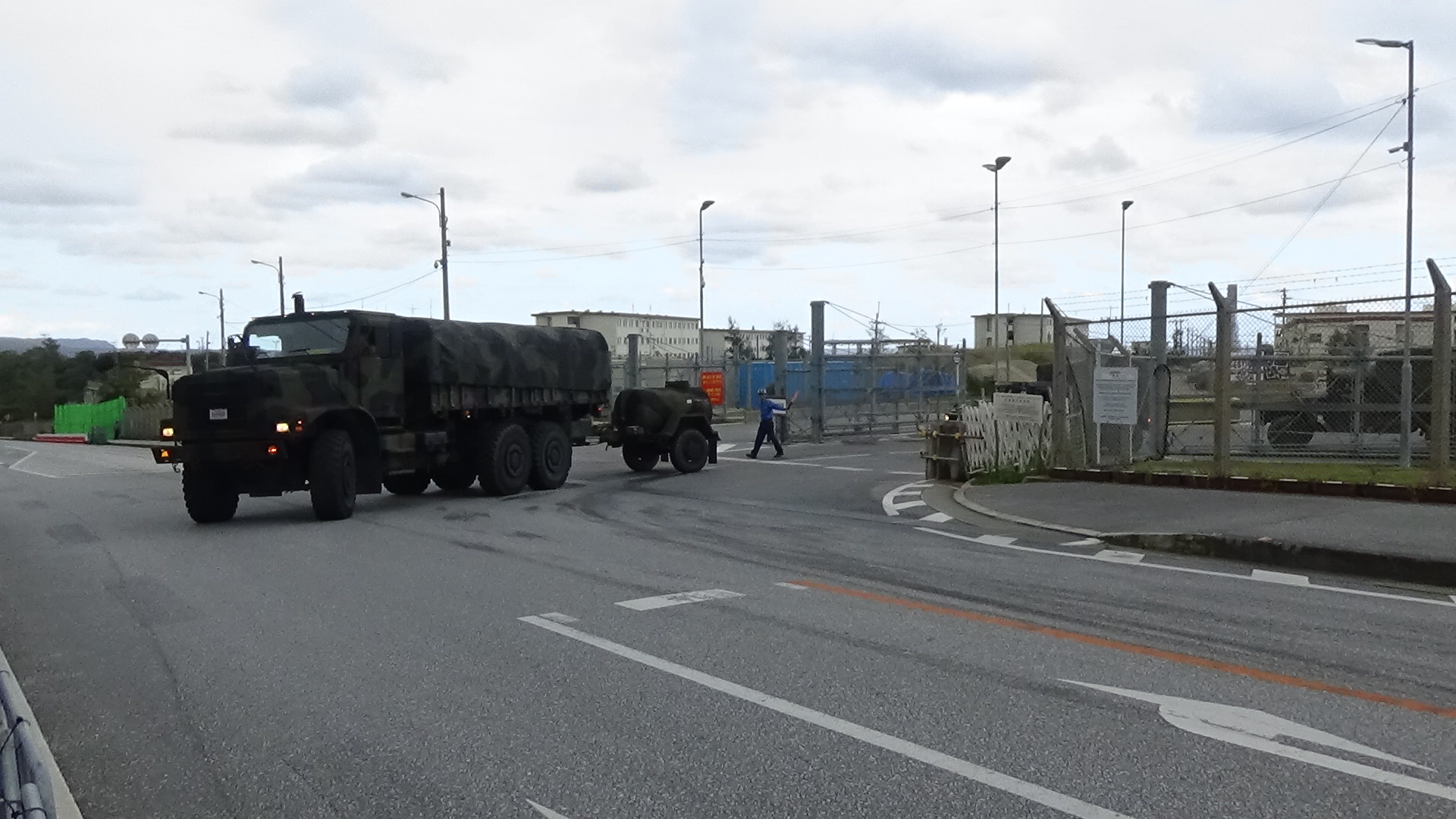 集会解散後の午後1時半過ぎ、フロートを満載したトラック2台が辺野古に向かっているという情報が入り、急きょゲート前に8人が集まり、搬入を阻止しようと待機した。沖縄県の埋め立て承認撤回はまだ生きており、この段階で工事を進めることは明らかに違法となる。数時間待機したが、結局トラックは現れなかった。基地内からの運転手への通報で搬入をあきらめたようだ。今夜未明にでも入れるかもしれない。