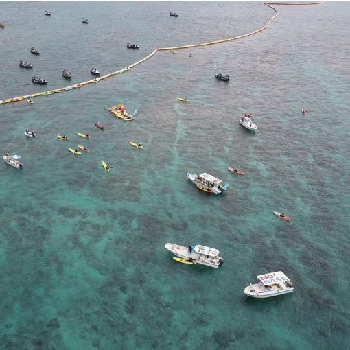 12時過ぎ、カヌーチーム10艇は桟橋に停泊している土砂を積んでいる台船に近づき、台船の離岸を約2時間にわたって阻止した。