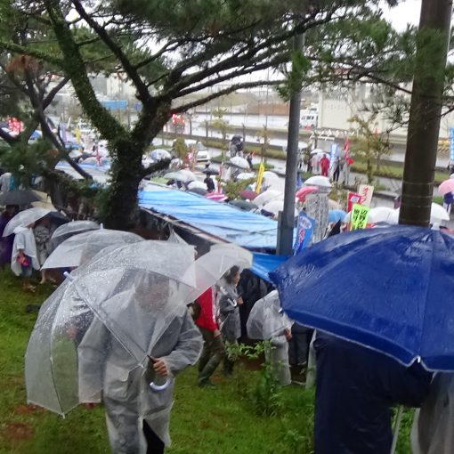 Co-representative of the Helicopter Base Objection Association Hiroshi Ashitomi stressed, “The opposition to construction of the new base is a fight for the people of Okinawa to decide the future of Okinawa. Although the government is forcing construction through, we fight to change society.” Upon hearing his words, citizens raised their fists.