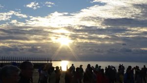 As they wished for a bright new year, singers and dancers performed Kagiyadefu and Tanchame. Around 7:30 a.m. sunlight emerged from between the clouds that covered the sky and shone on the Henoko sea and beach.