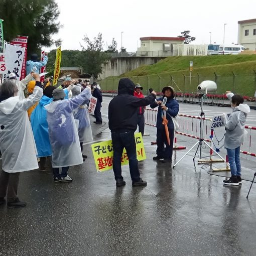 琉球セメントの安和(あわ)桟橋に機動隊が振り向けられたせいか、資材を積んだ車両は1時間遅れ10時にやってきた。40人余りで車両に向かい「美ら海を壊すな」「防衛局は違法工事をやめろ」と抗議の声を上げる。10時、12時半、15時の3回にわたり計216台の車両が入った。大型コンクリート壁を積んだ車両4台も確認。護岸道路用とみられる。