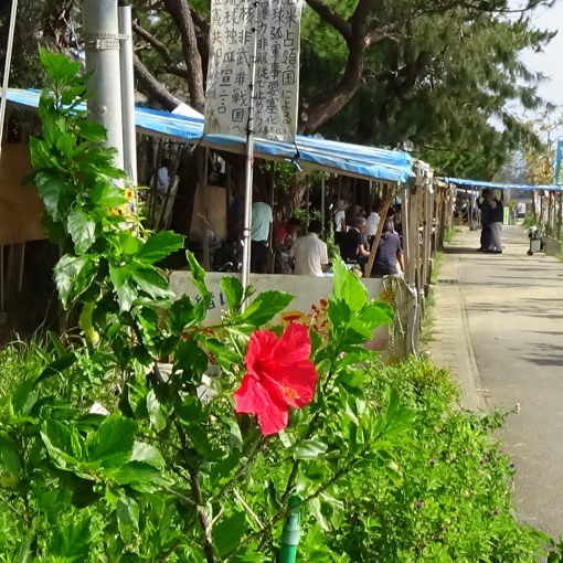 資材搬入の車両なし。9時半、数十人が琉球セメントの桟橋前へ応援に向かう。