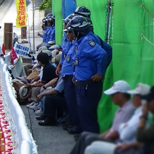週1回の集中行動で安和の桟橋に行く人が多く、ゲート前にはわずか15人。いつもと同じ時間に資材搬入車両が列を連ね、3回にわたり計278台がゲートに入った。ダンプが積んでいるのはN4護岸の基礎となるぐり石ばかりだ。毎日のようにやってくるNさんは、「毎日毎日、入るダンプを見て心が折れそうになる。だけど諦めたら終わり。辺野古の闘いは今や世界に流れている。自分たちの後ろには大勢の支援者がいるのだ、と思うことできょうも声を上げようと辺野古にやってくる」。強権政治を前に非暴力の座り込みは無力かもしれない。しかし粘り強いこの抵抗運動こそが今や世界の多くの人々の心を揺り動かしている。ゲート前座り込み1669日目。
