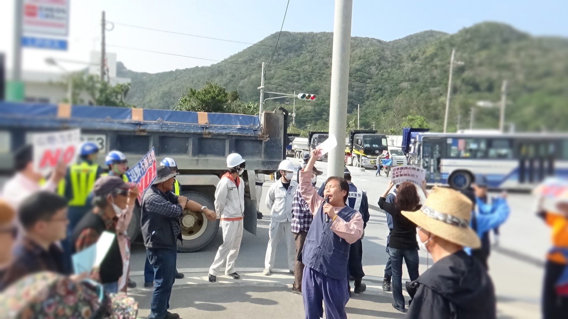 週1回の集中行動で安和の桟橋に行く人が多く、ゲート前にはわずか15人。いつもと同じ時間に資材搬入車両が列を連ね、3回にわたり計278台がゲートに入った。ダンプが積んでいるのはN4護岸の基礎となるぐり石ばかりだ。毎日のようにやってくるNさんは、「毎日毎日、入るダンプを見て心が折れそうになる。だけど諦めたら終わり。辺野古の闘いは今や世界に流れている。自分たちの後ろには大勢の支援者がいるのだ、と思うことできょうも声を上げようと辺野古にやってくる」。強権政治を前に非暴力の座り込みは無力かもしれない。しかし粘り強いこの抵抗運動こそが今や世界の多くの人々の心を揺り動かしている。ゲート前座り込み1669日目。