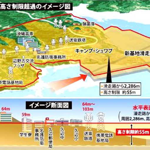 (2008 年 11 月更新。以下「統一基準」という。)では、航空機の安全な航行を目的と して、飛行場の周辺空間に進入表面、水平表面等の高さ制限(以下「高さ制限」という。) を設定しているところ、水平表面の高さ制限に関しては、滑走路の中心から半径 2,286 メートルの範囲に、滑走路から上空 45.72 メートルで設定されている。辺野古新基地の 滑走路は、標高に換算すれば約 8.8 メートルとなることから、標高約 54.52 メートルを 超える範囲に高さ制限が設定されることとなるが、辺野古新基地が完成して海兵隊飛行 場として供用された場合には、国立沖縄工業高等専門学校の校舎、米軍辺野古弾薬庫地 区内の弾薬倉庫、通信事業者及び沖縄電力の鉄塔、久辺小・中学校をはじめとする公共 建築物、周辺地域の民家やマンション等が高さ制限に抵触する。 統一基準の高さ制限に抵触する既存建物等が周辺に所在する場所を飛行場建設のため に埋立対象地として選定をすることは、公有水面埋立承認審査基準の「埋立をしようと する場所は、埋立地の用途に照らして適切な場所と言えるか」に適合せず、海兵隊飛行 場である辺野古新基地を建設するために辺野古沿岸を埋立てることは「国土利用上適正 且合理的ナルコト」の要件を充足していないと認められる。 この点、事業者も高さ制限に抵触する建築物等があることは否定するものではなく、 ただ、統一基準の適用除外に適合すると考えていると説明するものである。しかしなが ら、水平表面に係る高さ制限は、旋回飛行等、低空飛行をする航空機の安全を確保し、 航空機が安全に離着陸するために設けられているところ、高さ制限に抵触する建築物が あることは、住民の側からみれば、航空機の安全な航行を阻害する恐れのある建築物等 があり、統一基準の適用除外に適合することとなったとしても、常に、航空機事故等に よる住民への被害が発生する危険性をはらんでいることを否定しうるものではない。