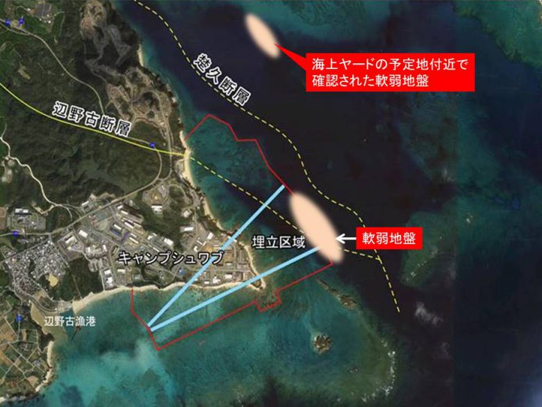 大浦湾側の埋め立てに使う大型ケーソン(コンクリート製の巨大な箱)の仮置き場として予定していた海上作業ヤードの付近に軟弱地盤があることがわかった。大型ケーソンは1基あたり長さ52m、幅22m、高さ24m、重量約7400トンにもなるもので38基が使われる。海上作業ヤードは工事終了後に撤去することになっており、原状回復が不可能な地盤改良工事はできない。現状のままで大型ケーソンを置けば転倒や沈下の危険性があることから、防衛局はすでに海上ヤードの設置を中止している。土木技師で平和運動家の北上田毅(きたうえだつよし)さんは「軟弱地盤は大浦湾一帯に広がる。別の場所を見つけるのは難しいだろう」と述べている。またも難題が露呈した。