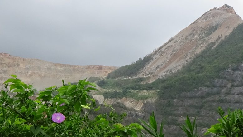 10人程で終日抗議行動。ダンプ490台が土砂を搬入し、運搬船2隻が出港した。写真は山肌がむき出しとなった安和鉱山。県内の岩石の産出地となっているこの付近は、数十年来の採掘でほどんどの山は緑を失っている。